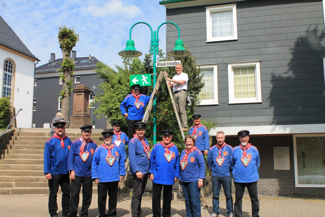 Seit heute, 16.00 Uhr heißt die Lindenstraße in Voerde für die bevorstehenden Kirmestage wieder Blaukittelallee. Bürgermeister Wilhelm Wiggenhagen nahm die symbolische Umbenennung im Beisein der Blaukittel höchstpersönlich vor, tatkräftig unterstützt vom diesjährigen Voerder Ehrennachtwächter Gerd Fischer.